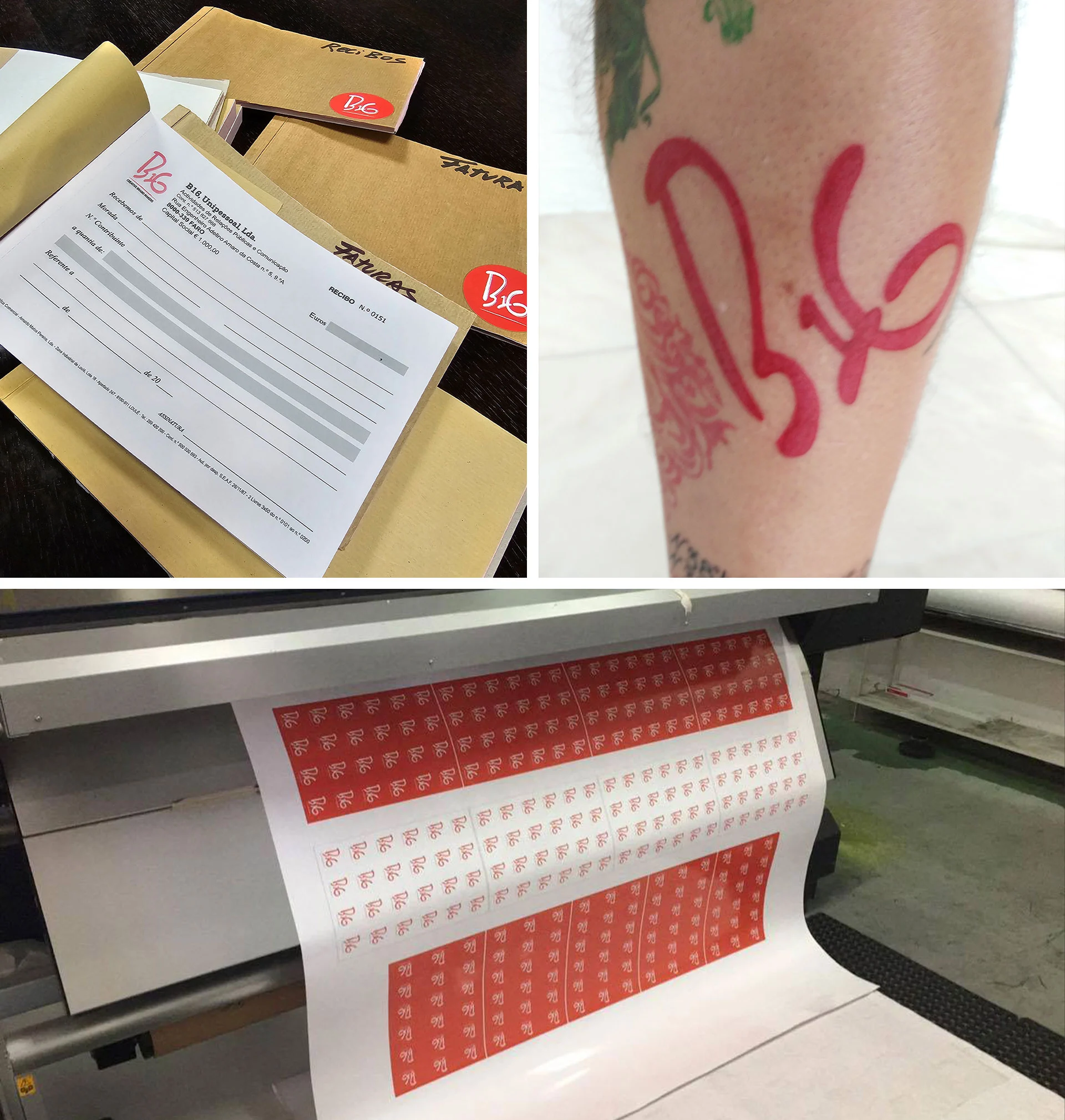 Começamos por fazer a Marca e uma miniapresentação, tipo Brand Book. Depois fizemos uma splashpage onde colocámos o logótipo, o slogan, os contactos e uma pequena mensagem de boas-vindas. Em paralelo, desenvolvemos a assinatura de e-mail. Mais tarde, produzi autocolantes, cartões de visita e estacionário digital. Tatuei a marca na perna! Mas, aquilo que mais gozo me deu, sinceramente, foi produzir os livros de faturas e os livros de recibos personalizados (sim, as faturas eram passadas à mão). Fi-lo na Gráfica Comercial, antigo fornecedor de projetos com que trabalhei, e senti-me importante quando lhes fui pedir para produzirem os livros de faturas e recibos do meu próprio projeto. Um marco interessante na minha vida. Acreditem.